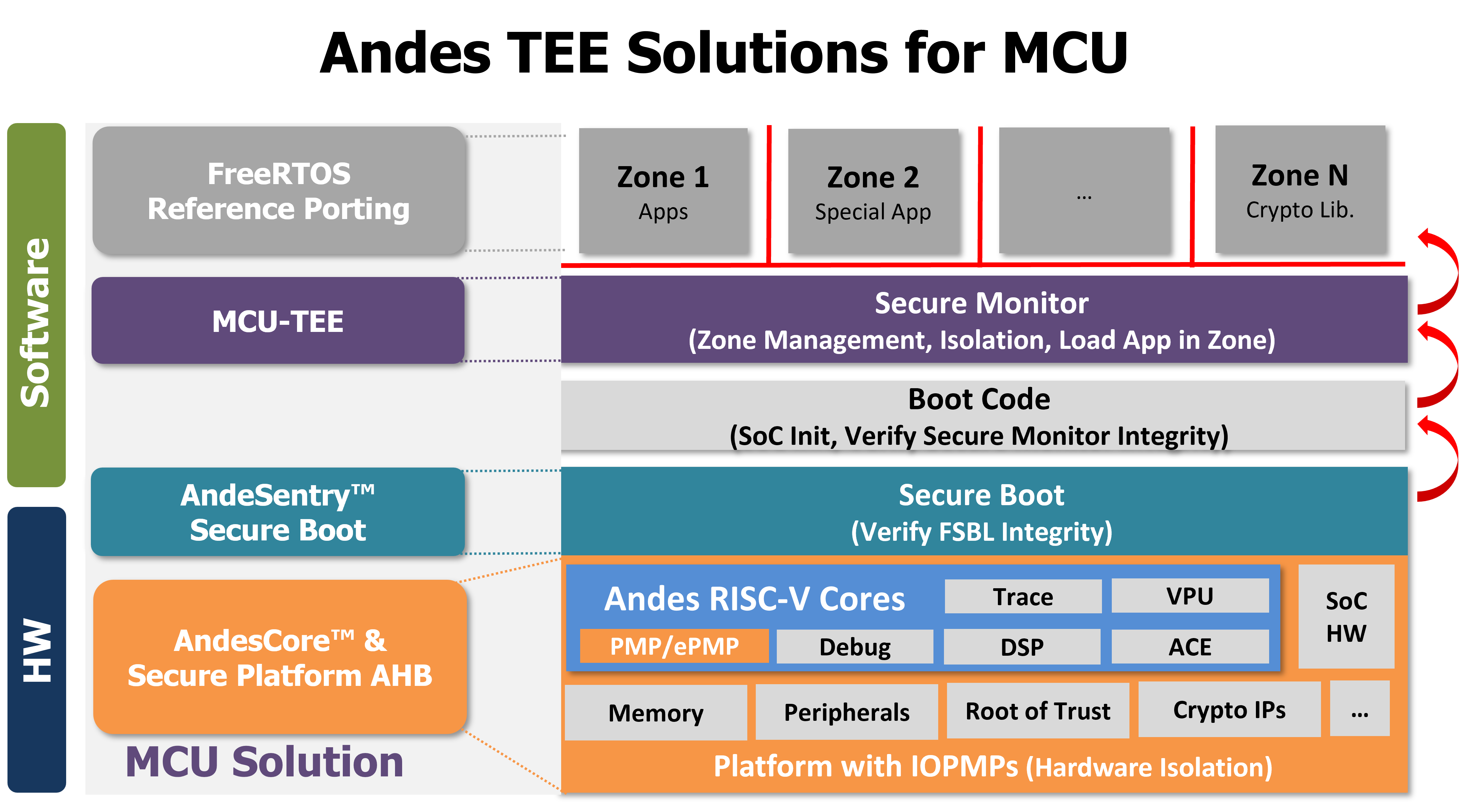 AndeSentry™ 安全合作框架整合了晶心科技及其他RISC-V生態系合作夥伴的資訊安全解決方案,以滿足不同層面與各式各樣的資訊安全需求。這些解決方案包含隔離執行、應用程式完整性、信任根(RoT)、密碼學IP、安全元件、安全開機、安全偵錯調試、用於可信任運行環境安全系統(TEE)的安全監控等。不僅如此,AndeSentry™ 安全合作框架持續不斷地擴展加入更多的解決方案。這些解決方案不僅適用於商業用途,亦可以幫助使用者符合國際安全標準的要求,或通過各種應用領域(如物聯網、消費品和汽車)的安全認證。而且其中一些解決方案已經有預先整合的展示項目,方便客戶進行評估和縮短開發週期。