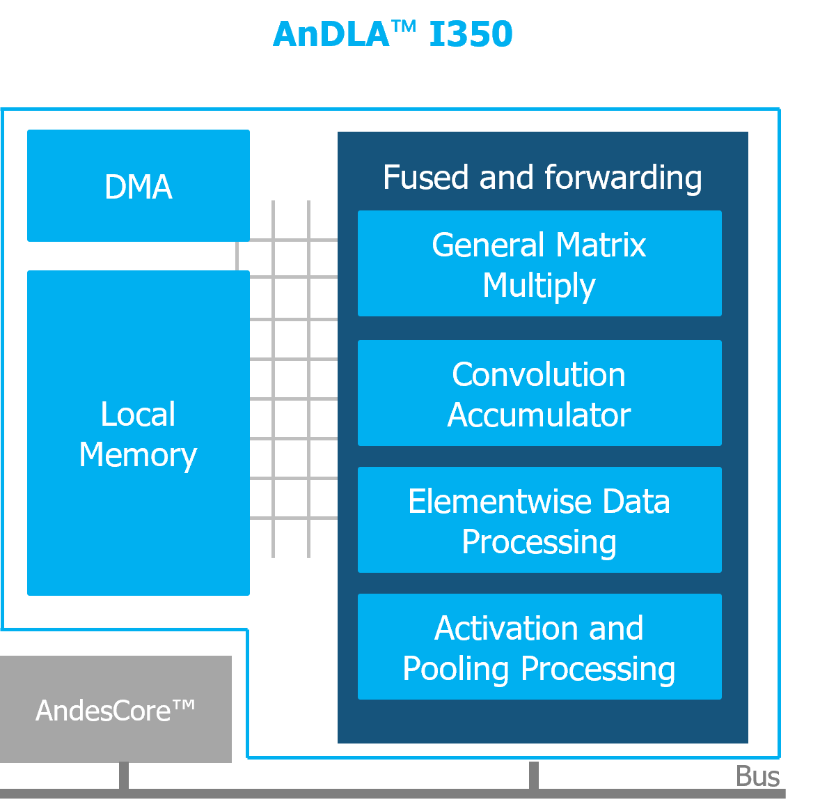 AndesAIRE™ AnDLA™ I350/I370 is a deep learning accelerator (DLA) designed to enable high performance-efficient and cost-sensitive AI solutions for edge and end-point inference.